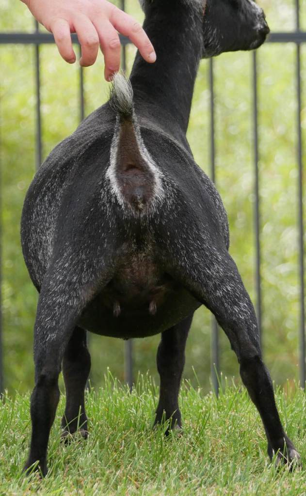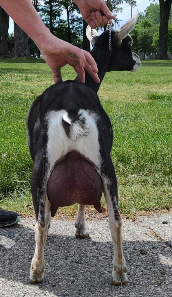 I am making a concerted effort to improve rump width, udder texture, butterfat components, and overall structure. It’s harder than it sounds. This girl has such a wide flat rump from thurl to thurl. She is very sweet, and I love her udder. She has very good capacity as a FF, strong attachments, and wide-open orifices. She also has two first place wins under her belt at age 1. Effie really has what I consider my ideal structure, with width and robustness. I don’t like frail goats who are hard to keep in condition, and Effie stands out as a really great balance of what I’m looking for.